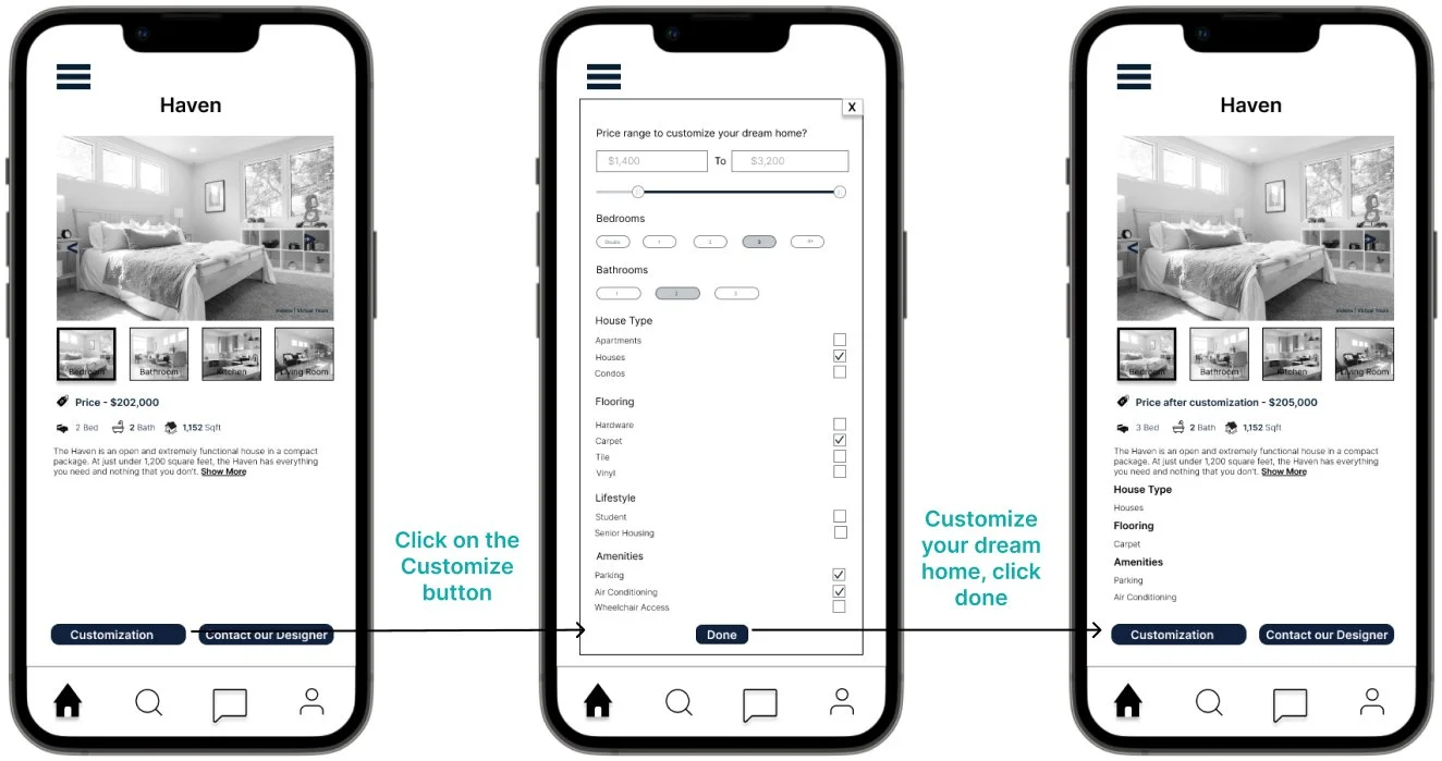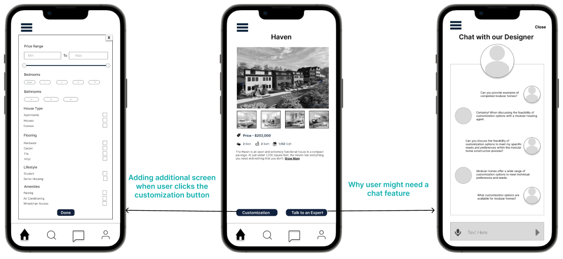 With our problem identified, we dived into ideation. We wanted to develop an mobile application that informs and reassures home buyers during a home buying process.