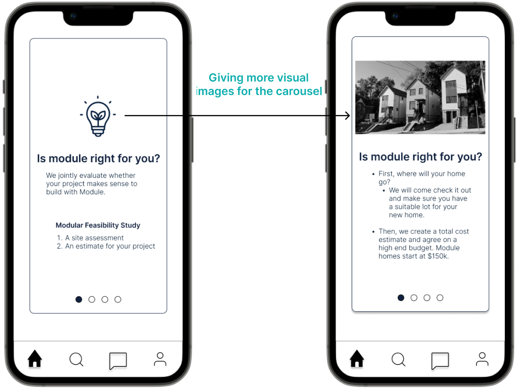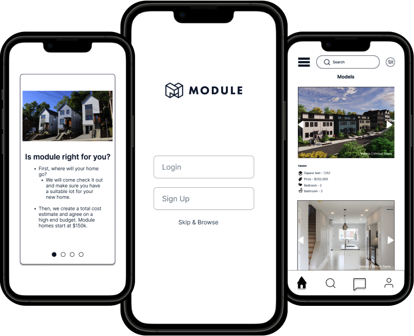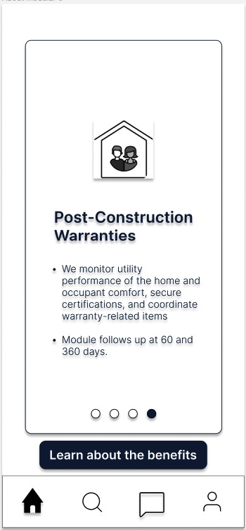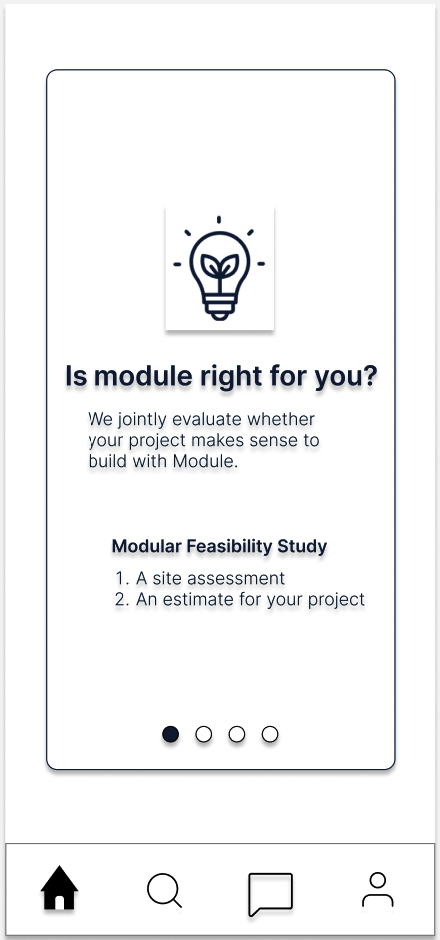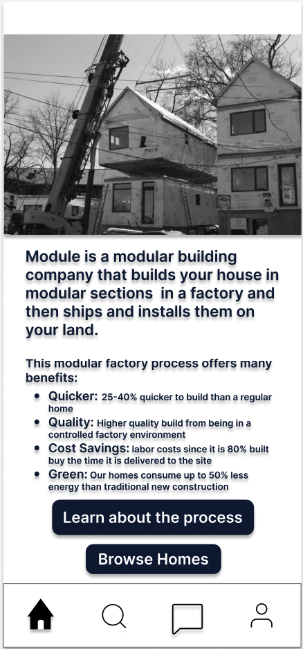 To design a user-friendly mobile app that informs and reassures the user throughout the onboarding experience. The app will be concise and visual with photos of the Module process, a clear breakdown of total costs, and thoughtful progress updates and tracking notifications for buyers. Ultimately the app will empower users to trust Module and feel confident in their understanding and its benefits.